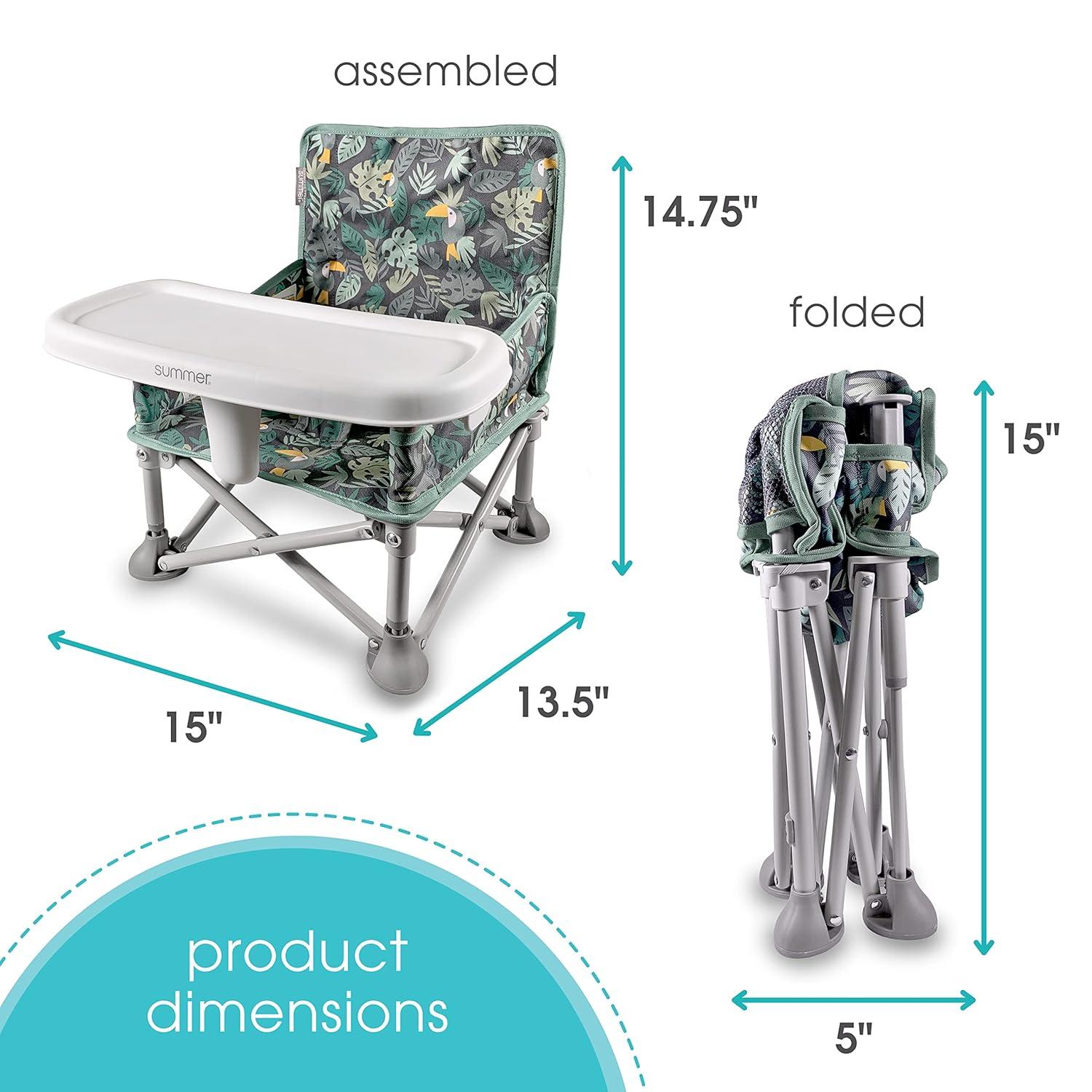 The original Summer Pop 'N Sit Portable Booster is the ultimate go & grow seat, with over 2 million sold worldwide! This #1 Booster Seat* has 3 modes of use: floor seat, feeding seat with removable tray, and toddler booster. For babies, attach to an adult chair using the included straps and BPA free tray to create a portable chair top high chair. For toddlers, use the seat as a booster that can pull up to the table by removing the tray. In floor mode, you can use the Pop ‘N Sit whenever you need an extra seat – picnics, sporting events, or right at home! The rear storage pocket holds your daily essentials. Folds compactly when not in use and includes a carrying bag with shoulder strap. This seat is a new parent must-have that requires no tools for assembly. Dishwasher safe tray. Seat and straps wipe clean with a damp cloth and mild soap. Folded dimensions: 15 x 13.5 x 14.75” or 5 x 15”. Made for 6 months to 3 years old or up to 37 pounds. Third party safety tested and approved. (*Circana, Retail Tracking Service, U.S., Highchairs-Boosters, dollar sales, Jan-Nov 2023 combined)